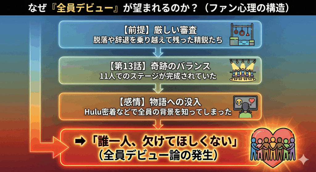 第13話の放送後、X上で特に目立ったのが「このまま11人でデビューしてほしい」「全員デビューでお願い」といった声です。