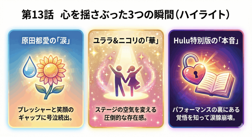 - 原田都愛さんの涙やユララさん・ニコリさんの華、Hulu特別版の密着などを通して、”人としての成長”を強く感じさせる回でもありました。