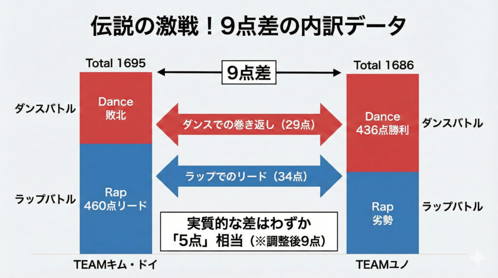 つまり、ラップで勝った34点リードから、ダンスで負けた29点を差し引いた「5点(調整後9点)」が、最終的な勝敗を分けたことになります。