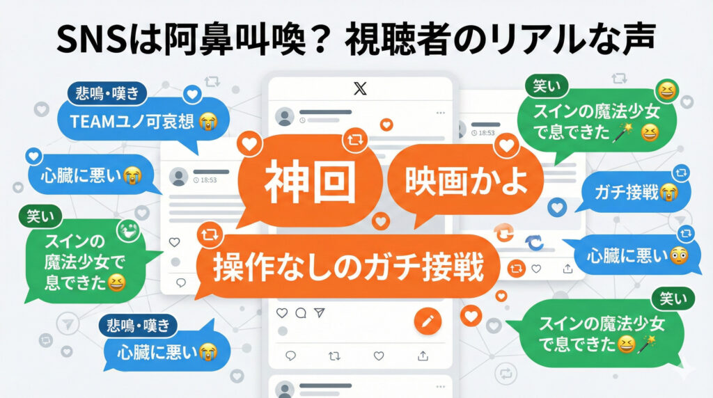 放送中から放送終了後にかけて、Xのタイムラインは阿鼻叫喚と歓喜が入り混じるカオスな状態でした。