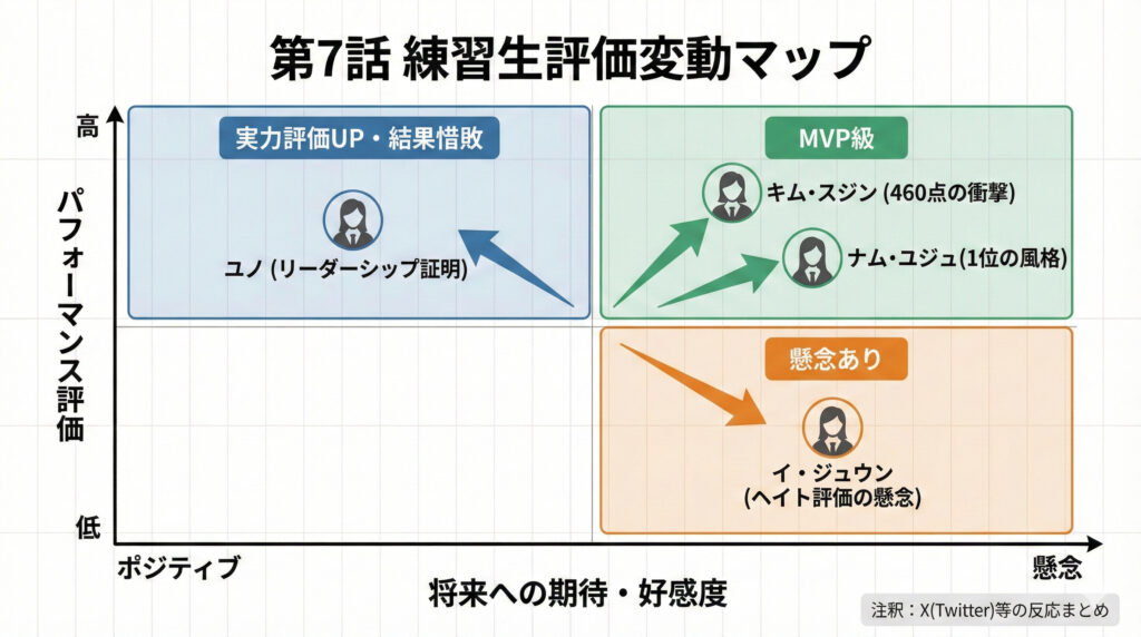 第7話は単なる通過点ではなく、練習生たちの「覚悟」が決まった分岐点でした。